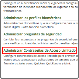 Las Contraseñas de acceso limitado minimizan el riesgo que presenta conectar su cuenta a aplicaciones de terceros al otorgarles acceso de solo lectura. Esto protege su cuenta de cualquier transacción no deseada o de filtraciones de información personal si las aplicaciones de terceros se ven comprometidas.