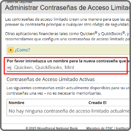 Cómo crear una contraseña de acceso limitado para cada aplicación de gestión financiera que desea vincular con su cuenta de la Banca en Línea de Woodforest: