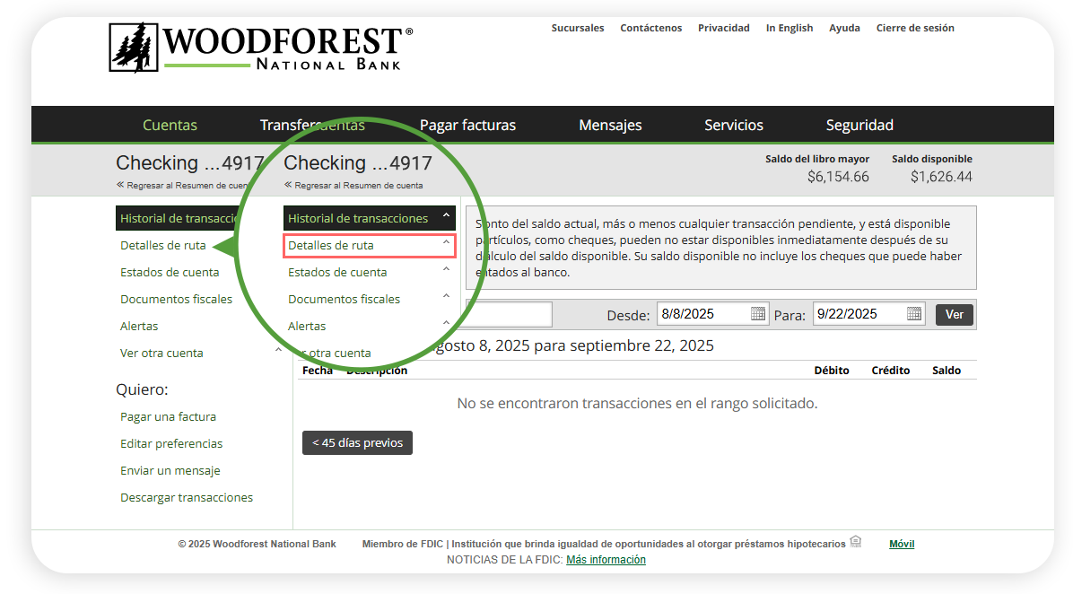 Los números de cuenta y de ruta pueden encontrarse en la Banca en Línea de Woodforest y nuestra Aplicación de Banca Móvil.